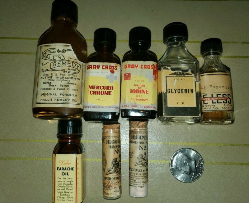 Title (ebay affiliate link): 8 Antique Clear/Amber Apothecary Pharmaceutical Bottles Humprheys No.1 Glycerin