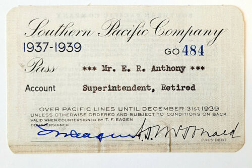 Title (ebay affiliate link): 1937-1939 Southern Pacific Company railroad triennial pass E R Anthony T F Eagen