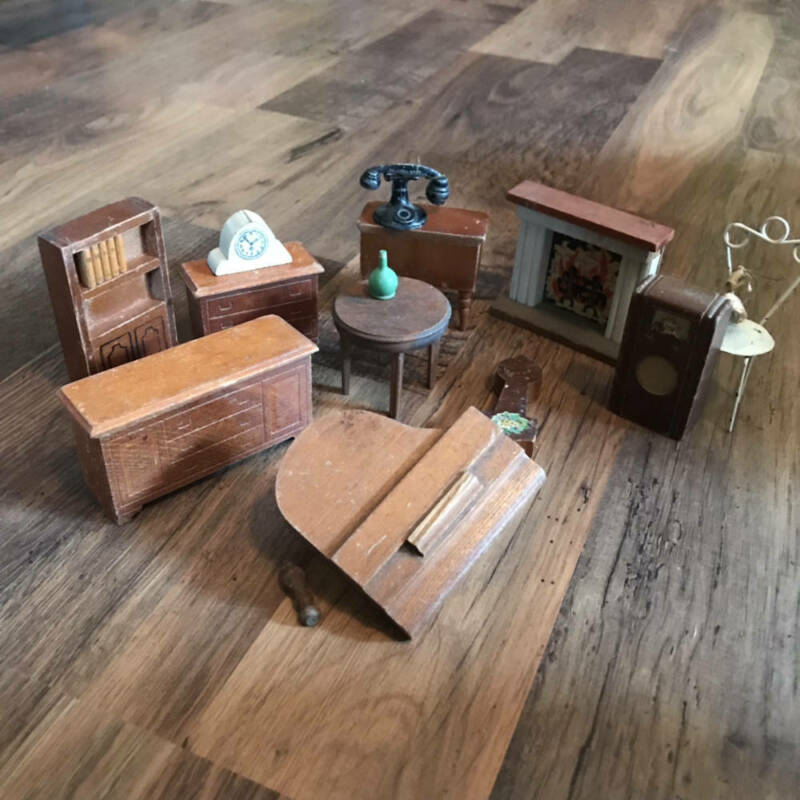 Title (ebay affiliate link): Vintage Wood Dollhouse Furniture Lot Piano Chairs Fireplace + More