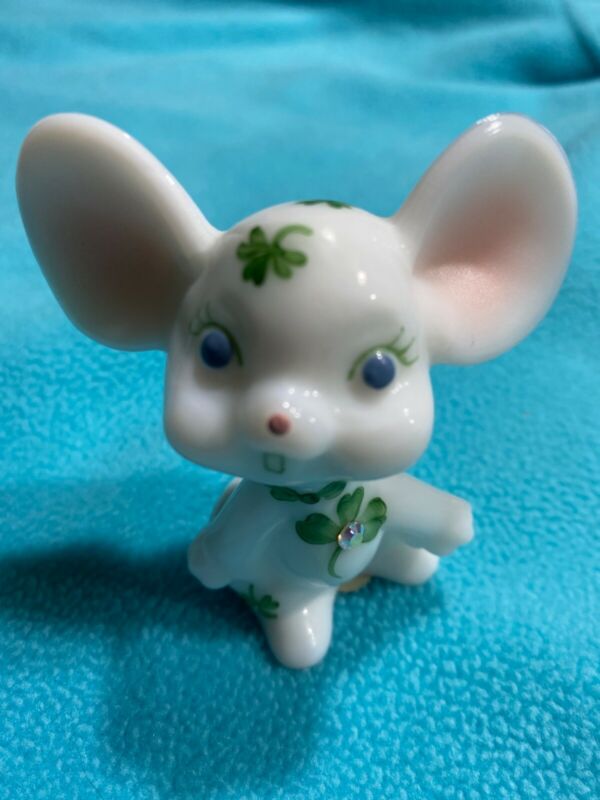 Title (ebay affiliate link): Fenton Milk Glass Mouse With Irish Shamrocks & Swarovski Crystal Holiday Parade