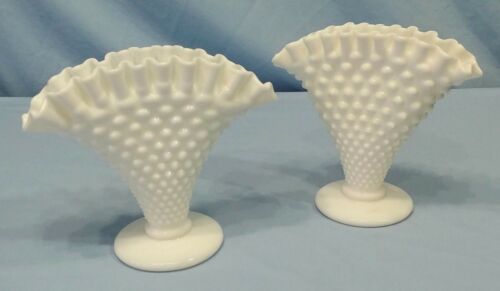 Vintage Fenton Milk Glass Hobnail Fan Vase Pair