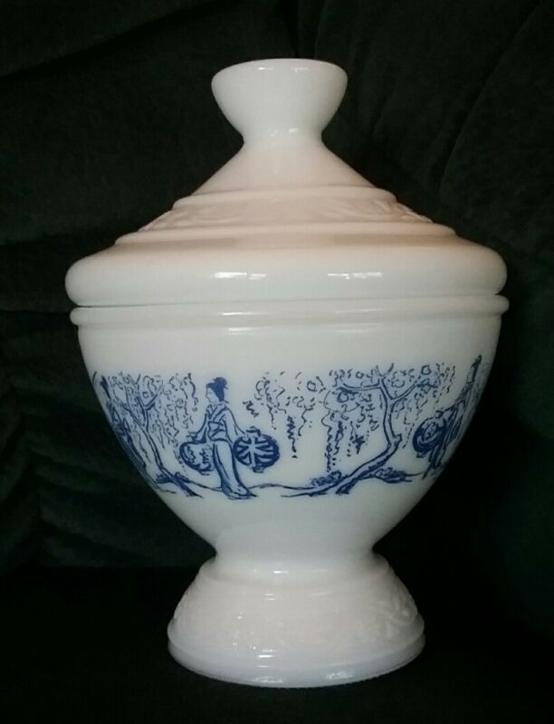 Title (ebay affiliate link): Blue & White Milk Glass Candy Nut Dish w/Lid Asian Design Made in Belgium