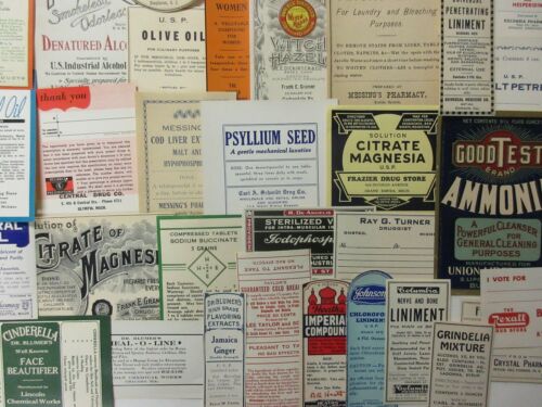Title (ebay affiliate link): 35+OLD LARGE PHARMACY-APOTHECARY-MEDICINE BOTTLE LABELS=EPHEMERA=NICE SELECTION