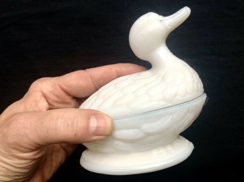 Title (ebay affiliate link): OPALESCENT WHITE OPALINE MILK GLASS EAPG REALISTIC FIGURAL DUCK CANDY COMPOTE