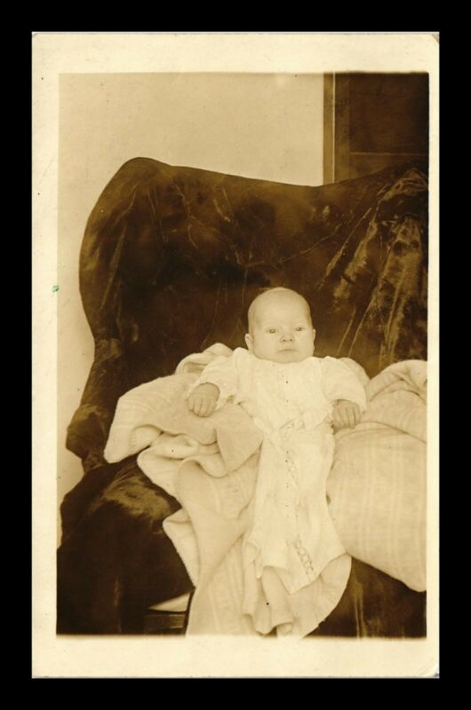 Title (ebay affiliate link): US POSTCARD RPPC LITTLE BABY IN WHITE DRESS SITTING ON CHAIR