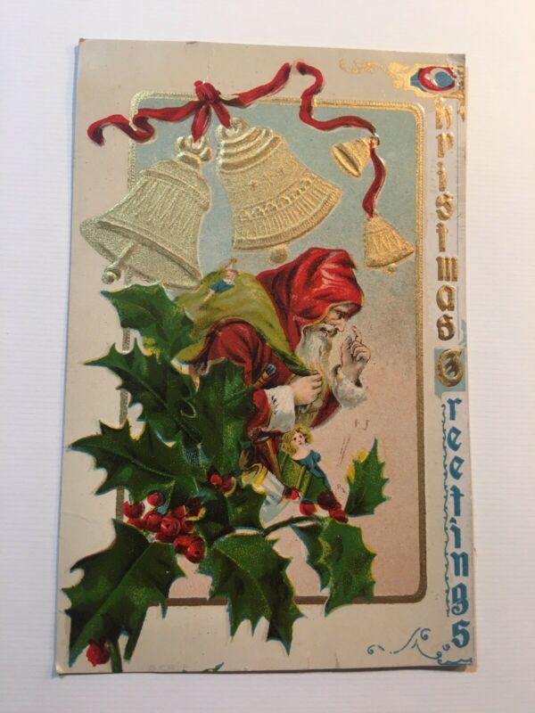 Title (ebay affiliate link): VINTAGE EMBOSSED CHRISTMAS POSTCARD SANTA W/TOYS UNDER GOLDEN BELLS 1910