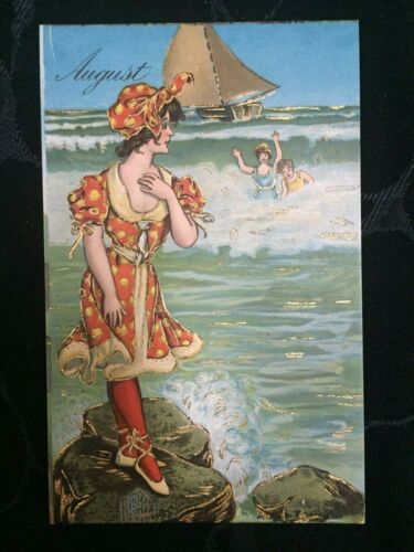 CEB #1925,8 Antique Postcard - "August" girl standing on rock/water/gold enhance