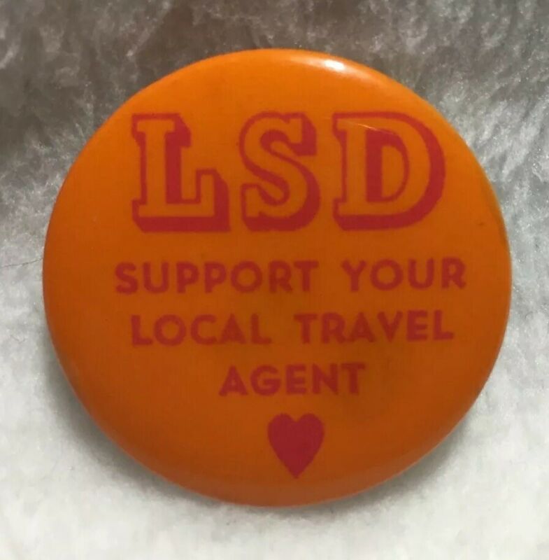 Title (ebay affiliate link): Vintage 1960s Support Your Local Travel Agent Heart Love Hippie LSD Pot Pin