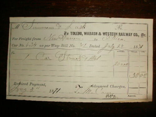 Title (ebay affiliate link): TOLEDO WABASH & WESTERN RAILWAY 1871 FREIGHT BILL LOT B-7 FREE SHIPPING