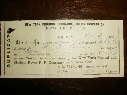 Title (ebay affiliate link): NY CENTRAL & HUDSON RIVER RAILROAD NEW YORK 1882 GRAIN INSPEC RECEIPT LOT B-8