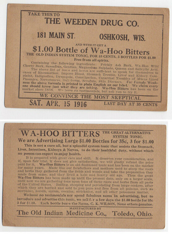 Title (ebay affiliate link): 1900''s TRADE CARD " WA-HOO BITTERS " WEEDEN DRUG CO. Oshkosh, Wi Wisconsin