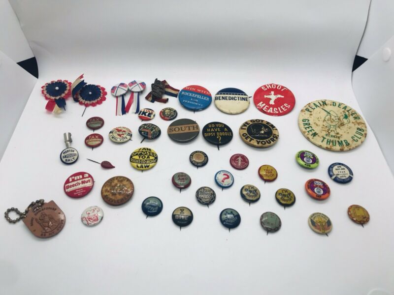 Title (ebay affiliate link): Lot 42 Vintage Authentic Political Campaign Advertising Funny Club Button Pins