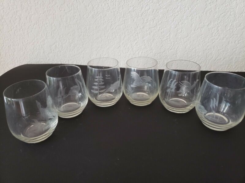 Antique Hand Cut lot of 6 Crystal Glass Hunting Birds Design Wine Glasses