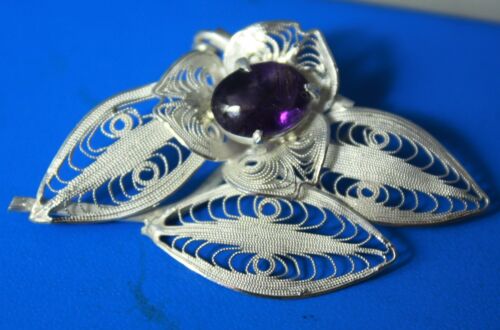 Antique Sterling Silver 925 Filigree Floral Brooch Pin with Amethyst Stone