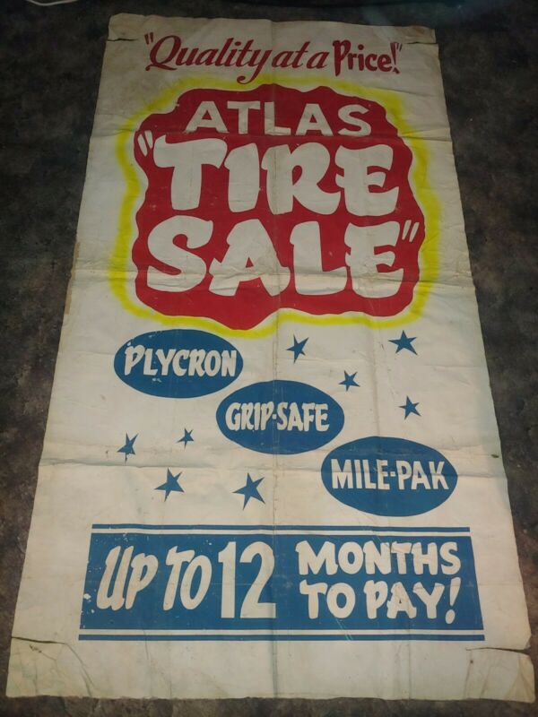 Title (ebay affiliate link): Vintage Gas Station Atlas Tire Advertising Large Oil Cloth Banner