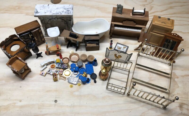 Title (ebay affiliate link): Lot Dollhouse Furniture Antique Tub Ice Chest Bed Food Dishes Mantle Piano Bust
