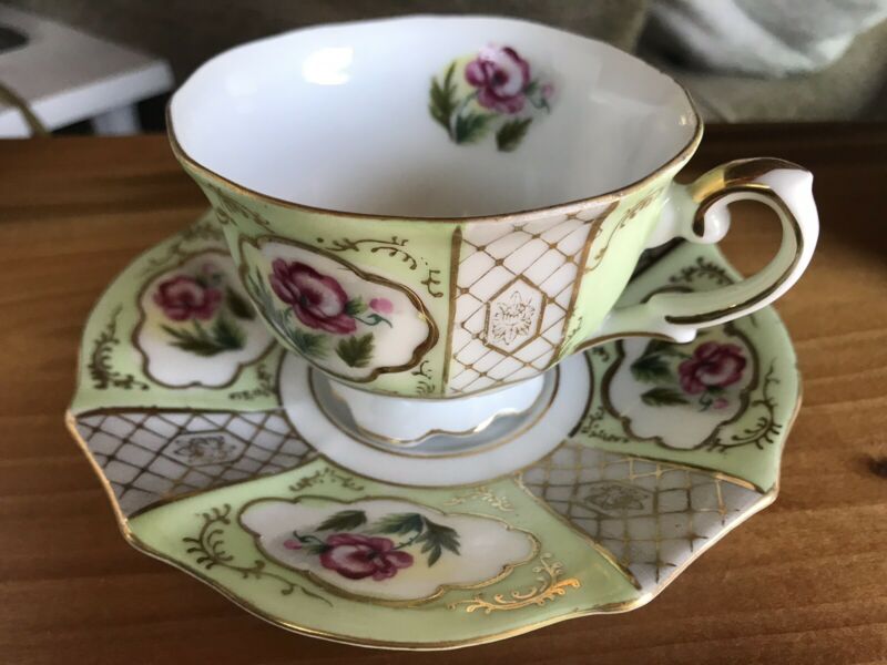 Title (ebay affiliate link): Old Gold Crown M Japan Hand Painted Floral/Lattice Design Cup and Saucer