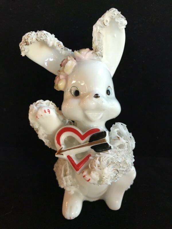 Title (ebay affiliate link): Vintage Arnart White Valentine Bunny Figurine with Spaghetti Trim & Heart Arrow