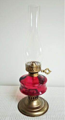 Title (ebay affiliate link): Vintage small Oil Lamp with Red Cranberry Font and Chimney. Made in Hong Kong.