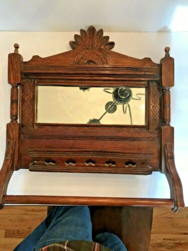 ANTIQUE PRIMITIVE WOOD MIRROR TOWEL BAR RACK WITH POCKET HOLDER WALL BATHROOM