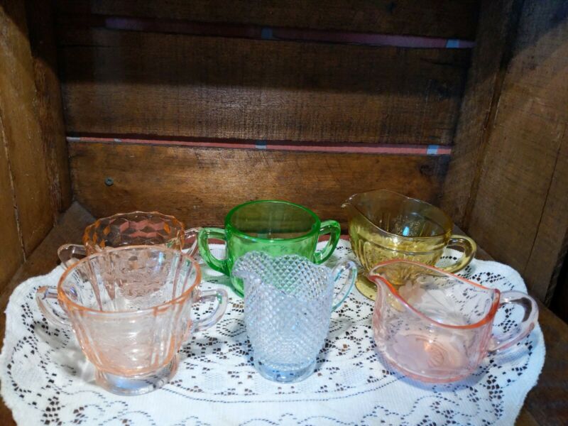 Title (ebay affiliate link): Mixed Lot Depression Glass Creamer Sugar Bowl Pink Green Clear Etched