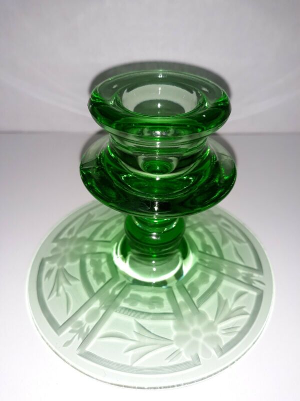 Vintage Green Glass Candlestick Holder w/ etched flowers 3 1/2" T