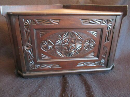 VINTAGE SMALL HANGING CORNER CUPBOARD CARVED DOOR in DARK OAK FINISH c.1950''s