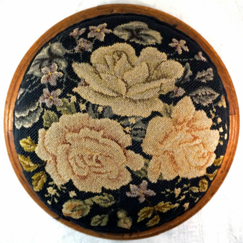 Title (ebay affiliate link): Antique 3 Footed Low Wooden Footstool with Needlepoint Flowers Fabric