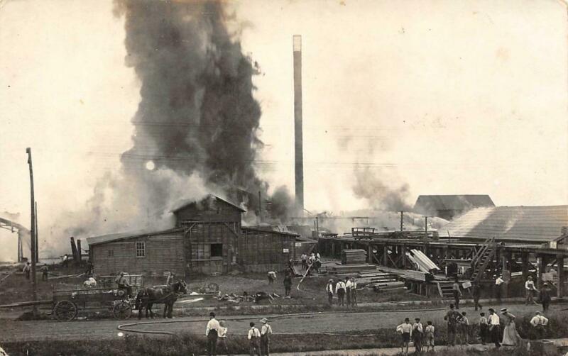 RPPC Lumber Mill Fire Horse-Drawn Cart Logging Photo c1910s Vintage Postcard