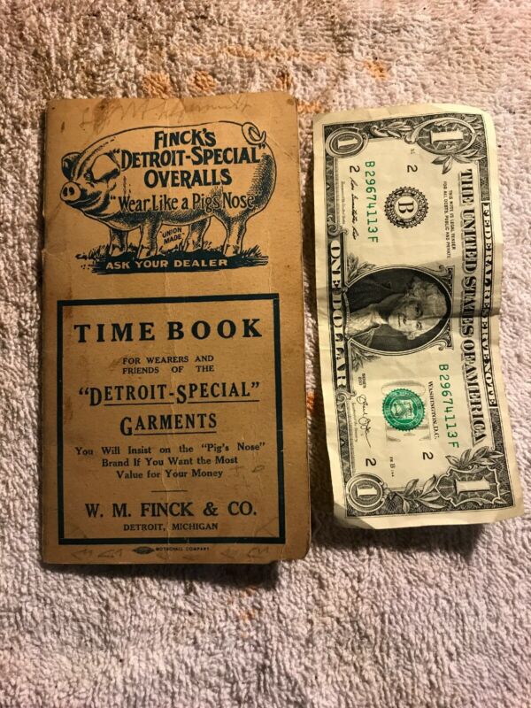 Vintage Rare Original Adv Finck''s Detroit Special Overalls Pigs Nose time book.