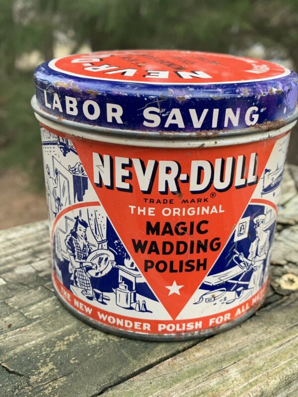 Title (ebay affiliate link): Vintage 1950s Never Dull Magic Wadding Polish Tin Litho Metal Can Gas Oil Sign