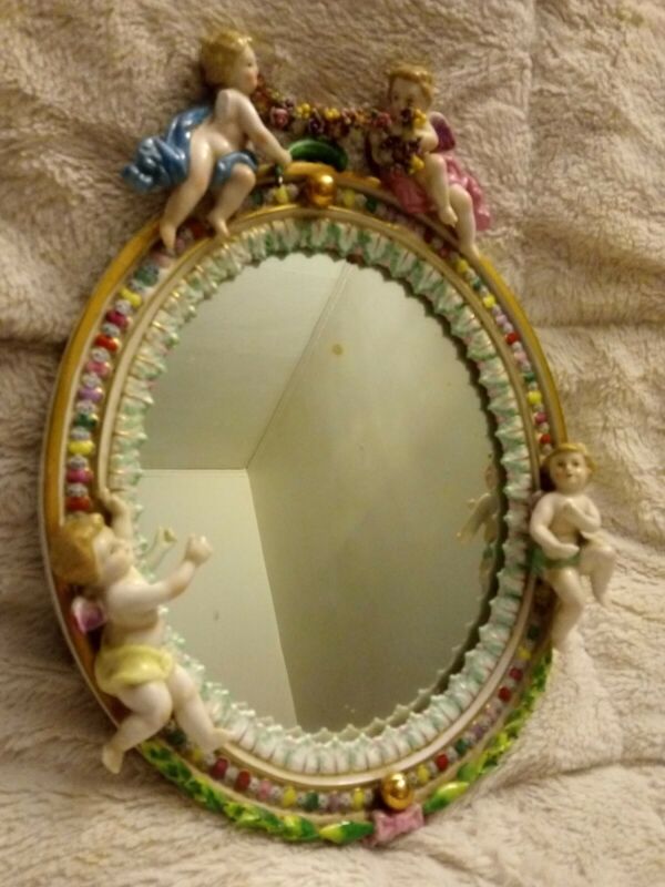 14" Antique Handpainted Porcelain Cherub Figural Mirror