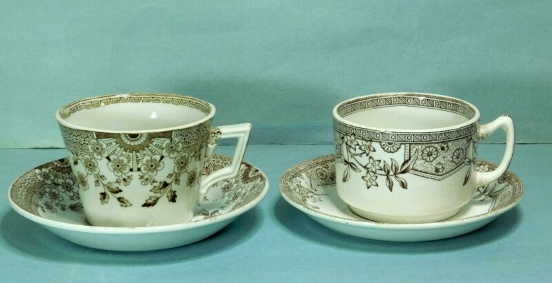 2 Antique Aesthetic Brown TransferWare Cup Saucer Fenton Foley Alcock Jessamine