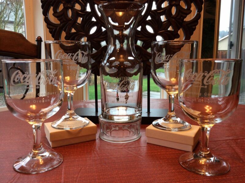 Beautiful Mint Coca Cola Wine Set Coke Employee Glasses & Decanter Mid 1980''s