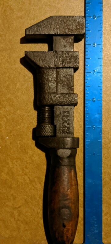 Title (ebay affiliate link): Vintage Antique PS & W Co 9" Wood Handle Adjustable Pipe Wrench USA
