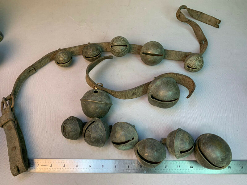 Title (ebay affiliate link): 13 Antique Brass Petal Sleigh Bells Horse Leather Strap Tack Graduated Numbered
