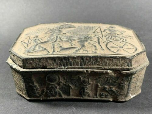 Title (ebay affiliate link): ANCIENT EGYPTIAN STONE BOX RAMESSES II IN BATTLE, HIEROGLYPHS & SPHINX C. 1200BC