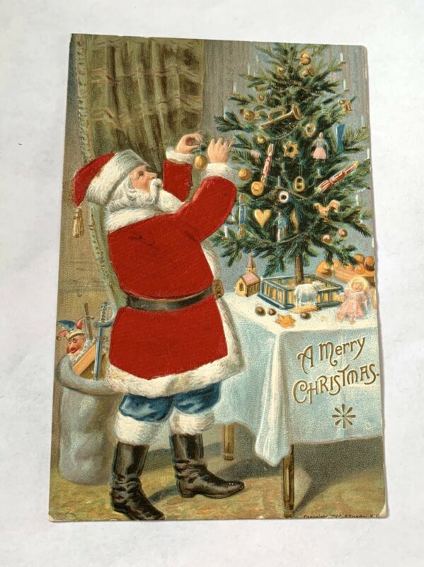 Title (ebay affiliate link): Vintage 1906 Real Silk Christmas Postcard - Santa Claus Decorates Christmas Tree