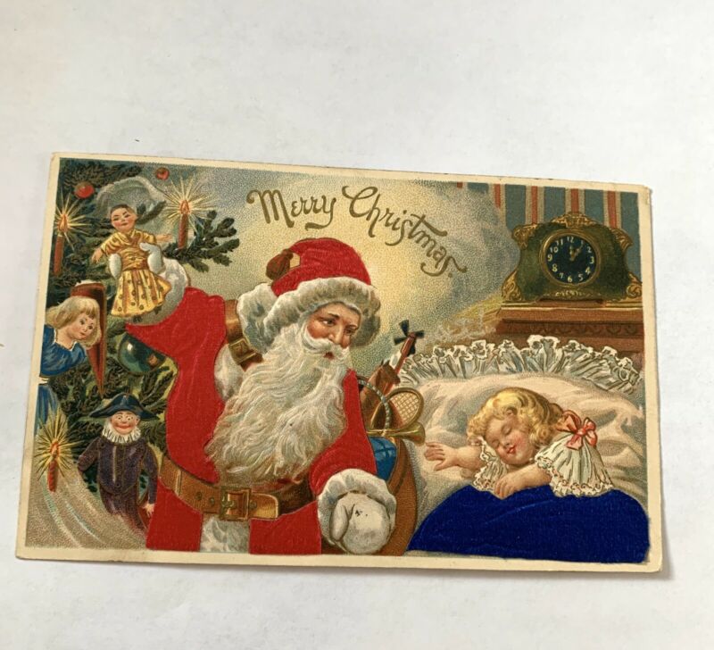 Title (ebay affiliate link): Vintage 1909 Real Silk Christmas Postcard - Santa Claus With Dolls Sleeping Girl