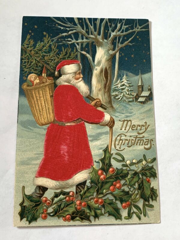 Vintage Real Silk Christmas Postcard - Santa Claus Walks Through Woods With Toys