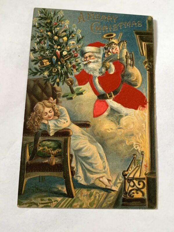 Title (ebay affiliate link): Vintage 1906 Real Silk Christmas Postcard Santa Claus Comes Out of Chimney Tree