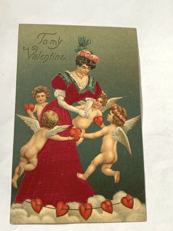 Title (ebay affiliate link): Vintage Valentine Postcard - Real Silk Pretty Woman Playful Cherubs