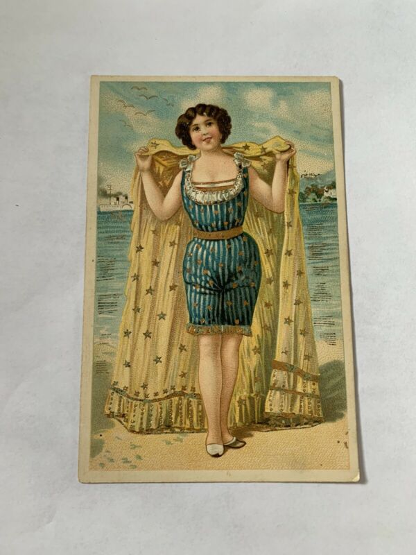 Title (ebay affiliate link): Vintage Bathing Beauty Postcard - Pretty Women Blue Suit - Gold Robe Embellished