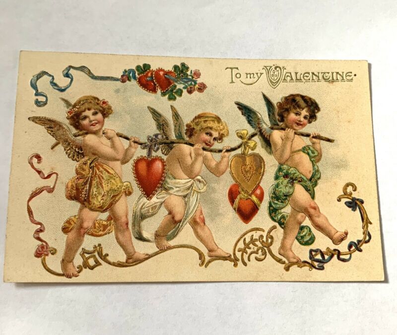Title (ebay affiliate link): Vintage PFB Valentine Postcard - Gold Embellished Cherubs Carry Hearts # 7185