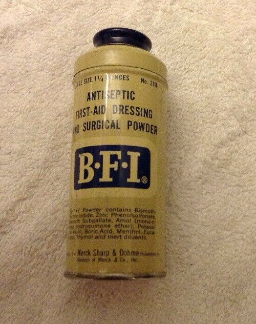 Title (ebay affiliate link): Vintage BFI Antiseptic First Aid Dressing And Surgical Powder Tin-Full