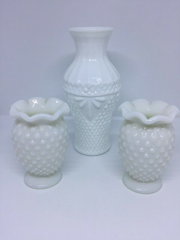 Title (ebay affiliate link): 3 Vintage White Milk Glass Vase Hobnail Ruffle edge bud vases