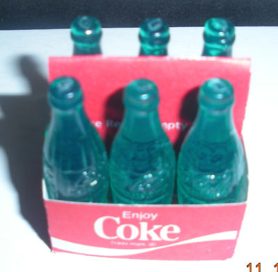 Title (ebay affiliate link): Vtg Miniature Coca-Cola Plastic Green Bottles w/ Holder