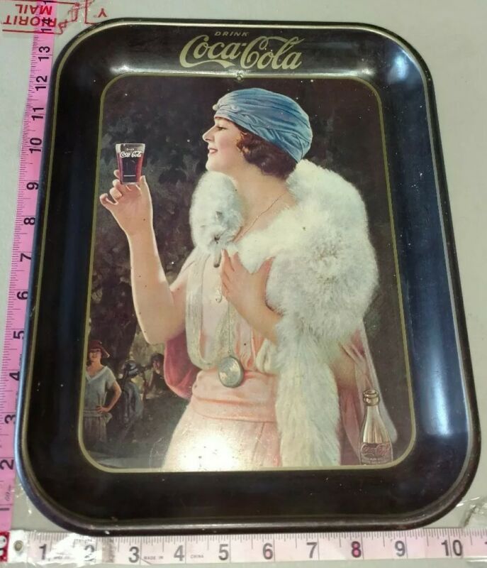 Title (ebay affiliate link): Vintage Coca-Cola tray, lady in pink Fox holds cup up, used