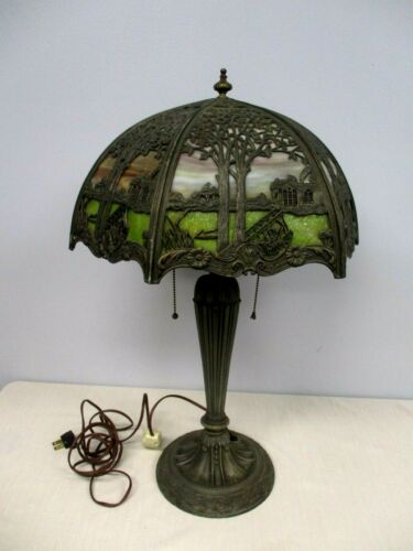 ANTIQUE SLAG GLASS LAMP with TREES & COTTAGE SCENE