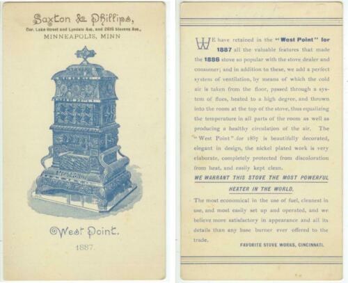 1887 Saxton & Phillips ornate West Point Stove heater trade card Minneapolis MN